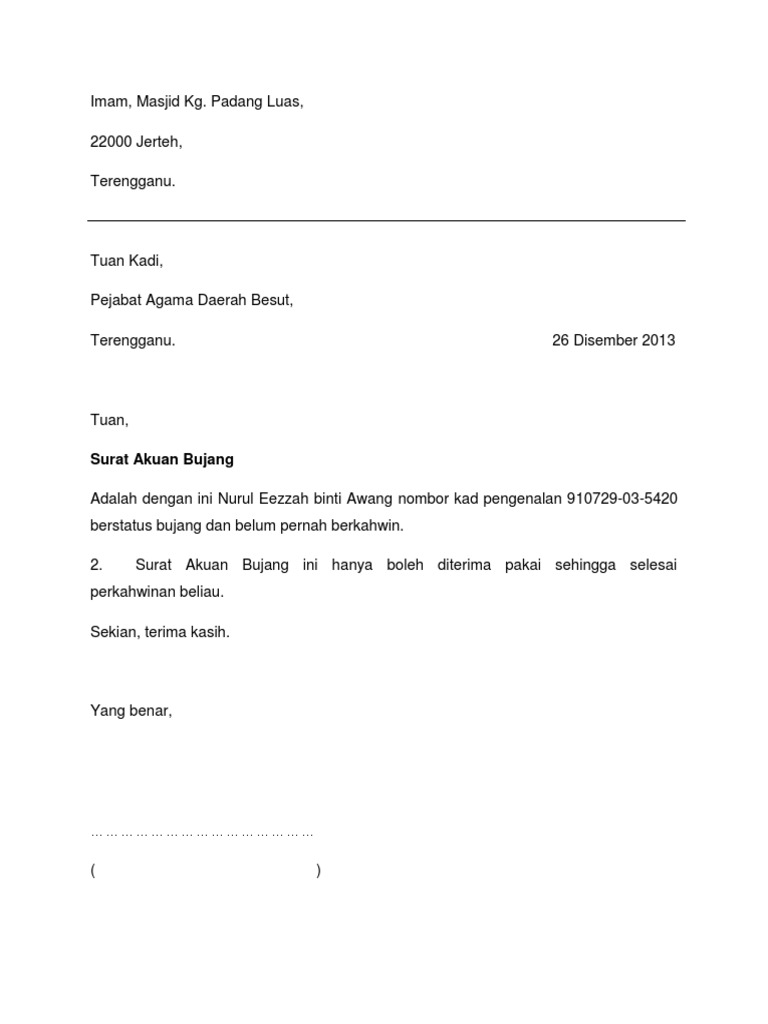 Surat akuan bujang merupakan antara perkara penting yang perlu disediakan bagi memohon kebenaran untuk berkahwin. Contoh Surat Akuan Bujang Dalam English Contoh Surat. Literally its letter of certification.